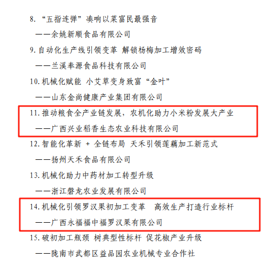 广西永福福中福罗汉果无限公司“机械化引领罗汉果初加工变化,高效出产打制行业标杆”典型案例以永福县罗汉果出产机械化示范为根本,别离是米粉初加工典型案例和罗汉果初加工典型案例。此中,特色农做物“产、初加工、发卖”一体化财产链项目84个。广西各级农机部分深切贯彻落练习总关于广西工做阐述的主要要求,共打制水稻“产、烘、储、初加工”一体化财产链项目69个,开展农机社会化办事功课面积4.2万多亩,为村落复兴供给财产支持?